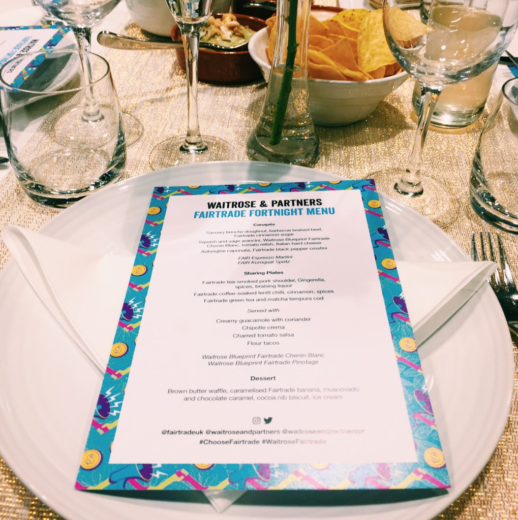 The menu was incredible; carefully selected to showcase the best Fairtrade ingredients it certainly did the job! The main course was a series of sharing plates: flour tacos with various toppings to choose from including Fairtrade tea-smoked pork shoulder, Fairtrade coffee-soaked lentil chilli and Fairtrade green tea and match tempura cod.
