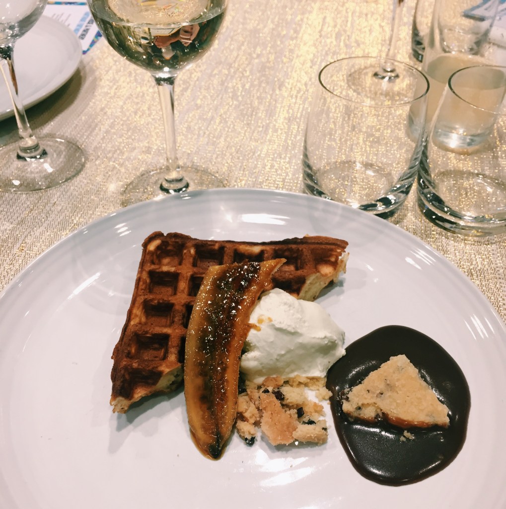 For dessert we had brown butter waffle, caramelised Fairtrade banana, muscovado and chocolate caramel, cocoa nib biscuit and ice cream. Again, delicious!